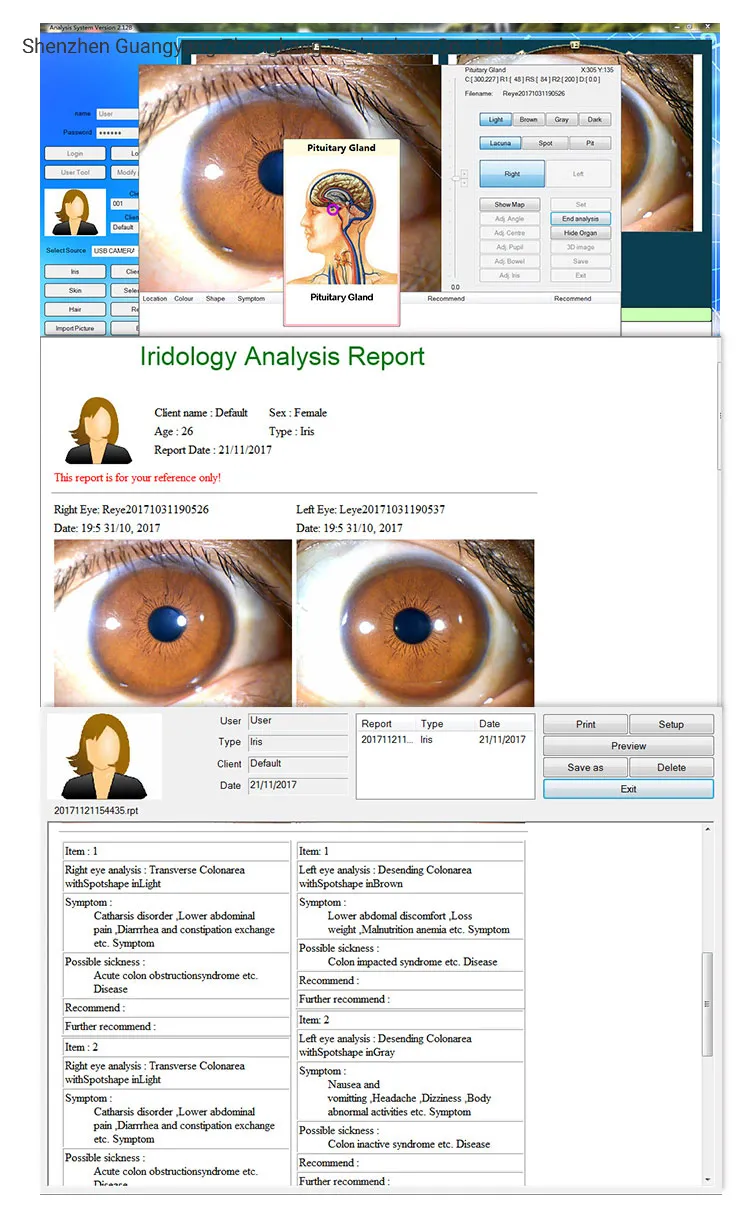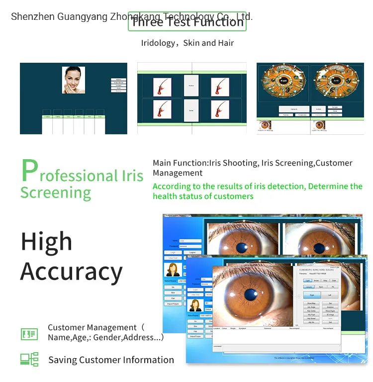 This machine will help the client know his health condition frankly, including problems from the past, present, and future. The Iridology system acts as a health counselor, guiding you on how to maintain wellness and prevent sub-health conditions.